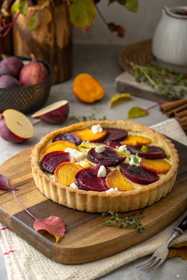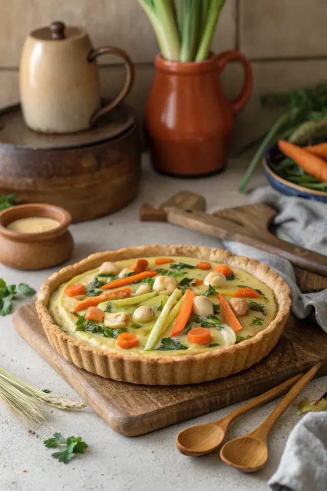Pastinaken und Karotten bringen Süße und Tiefe in die Tarte. Die vegane Creme aus Kichererbsen oder Hafermilch sorgt für eine samtige Konsistenz, ganz ohne tierische Produkte.